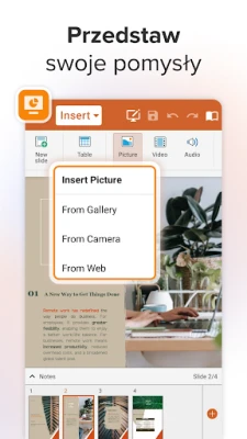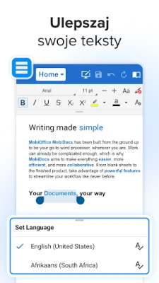 MobiOffice wyróżnia się także rozbudowanym zarządzaniem plikami PDF. Możesz nie tylko otwierać i odczytywać dokumenty PDF, ale również dodawać do nich adnotacje, pracować z formularzami do wypełniania i składać cyfrowe podpisy. Aplikacja umożliwia również konwersję plików PDF na formaty Word, Excel czy ePub, znacząco rozszerzając Twoje możliwości edycyjne. Stworzone z myślą o pracy w drodze, MobiOffice bezproblemowo integruje się z popularnymi usługami chmurowymi, takimi jak Google Drive, OneDrive, Box czy Dropbox, a także oferuje 5 GB darmowego miejsca w usłudze MobiDrive. Dostępność na platformach Android, iOS i Windows zapewnia spójne środowisko pracy na wszystkich Twoich urządzeniach, gwarantując zgodność z formatami Microsoft, OpenOffice i Apple iWork. Intuicyjny interfejs, zoptymalizowany pod kątem najnowszych wersji Androida, dostępny jest w ponad 65 językach.